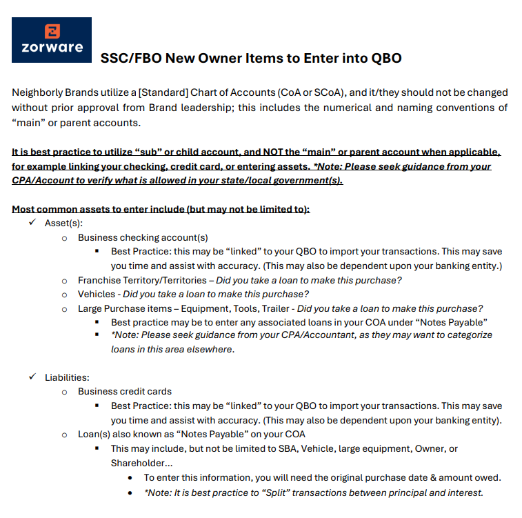 New Owner Items to Enter into QBO