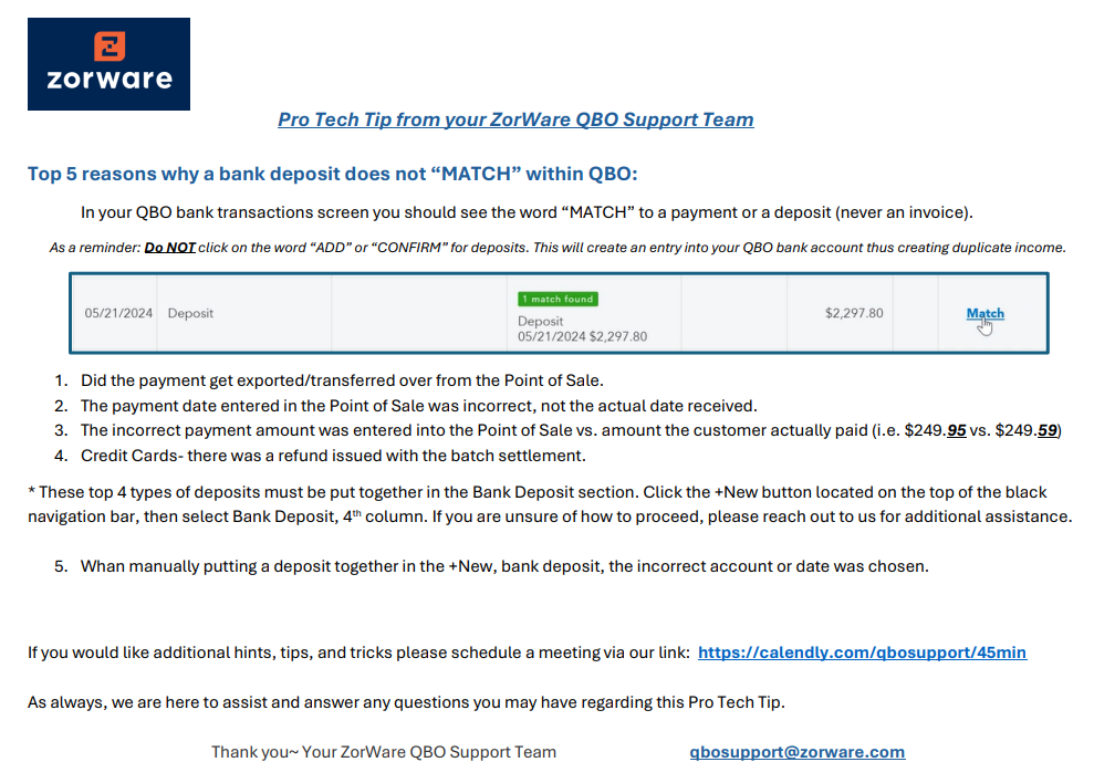 Top 5 Reasons Why a Bank Deposit Does Not “MATCH” Within QBO